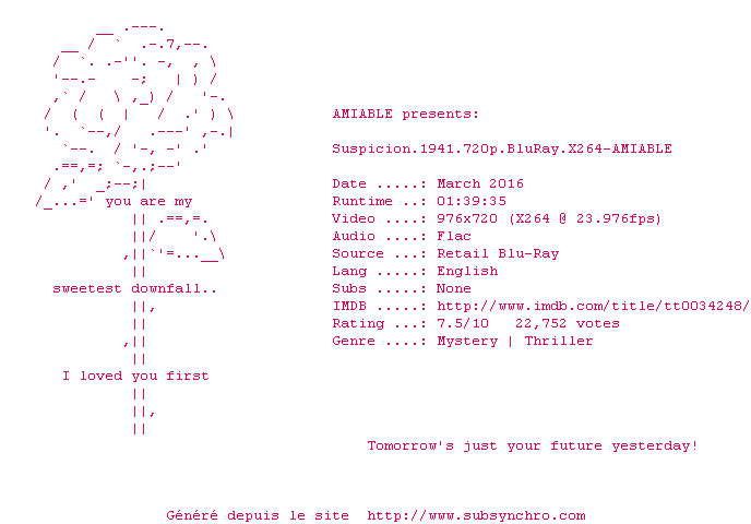 Suspicion.1941.720p.BluRay.X264-AMIABLE.srt Ce fichier a été testé et validé par Stank07 Ajouté par Stank07 Ajoute le 15-04-2016 17:16:01 Format : SRT Italique : Oui Taille : 0.00Ko Telechargement : 80 Testé par le membre Ajouter cette release à ma collection en cas de telechargement des sous-titres 0 0 0 Telecharger le ZiP contenant NFO, Affiche, Sous-titre (*.srt) Commentez le fichier Suspicion.1941.720p.BluRay.X264-AMIABLE.srt Commentez le fichier Suspicion.1941.720p.BluRay.X264-AMIABLE.srt Commentez ce fichier Le fichier 10452-1460733361.srt n'existe pas ! Telechargez le RSS « Fichier de la release Suspicion.1941.720p.BluRay.x264-AMIABLE » Retour au film « Soupçons »