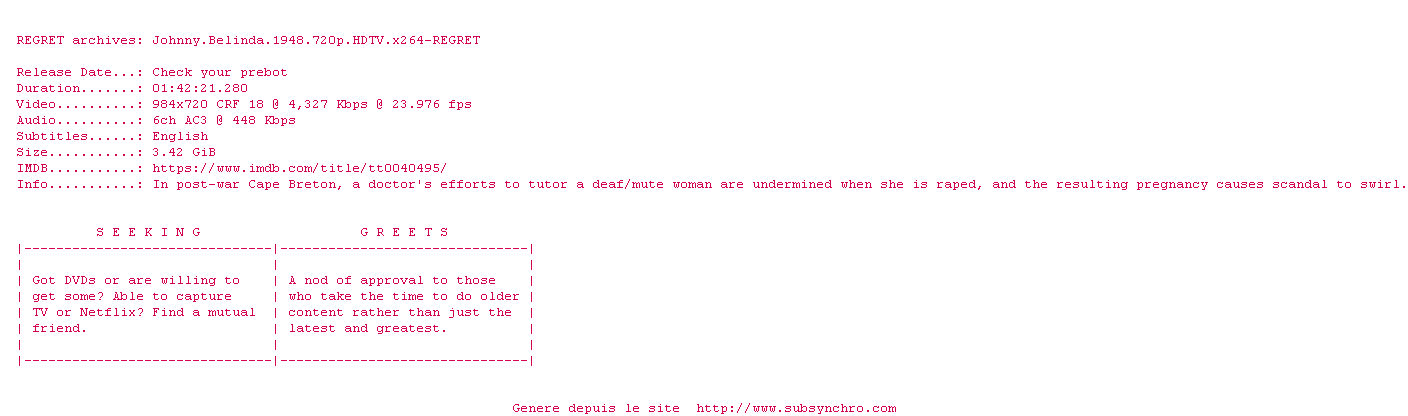 Johnny.belinda.1948.720p.hdtv.x264-regret.srt Ajouté par Antho1304 Ajoute le 03-08-2019 15:10:11 Format : SRT Italique : Oui Taille : 0.00Ko Telechargement : 7 Ajouter cette release à ma collection en cas de telechargement des sous-titres 0 0 0 Telecharger le ZiP contenant NFO, Affiche, Sous-titre (*.srt) Commentez le fichier Johnny.belinda.1948.720p.hdtv.x264-regret.srt Commentez le fichier Johnny.belinda.1948.720p.hdtv.x264-regret.srt Commentez ce fichier Le fichier 6970-1564837811.srt n'existe pas ! Telechargez le RSS « Fichier de la release Johnny.Belinda.1948.720p.HDTV.x264-REGRET » Retour au film « Johnny Belinda, l'enfant du silence »