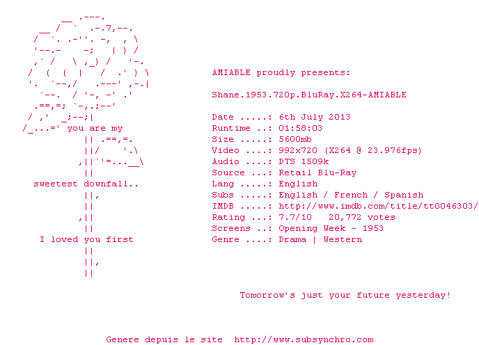 Shane.1953.720p.BluRay.X264-AMIABLE.srt Ajouté par Dzoolander Ajoute le 18-02-2014 19:16:19 Format : SRT Italique : Oui Taille : 0.00Ko Telechargement : 145 Sous-titre Extrait d'un DVD Z2 Ajouter cette release à ma collection en cas de telechargement des sous-titres 0 0 0 Telecharger le ZiP contenant NFO, Affiche, Sous-titre (*.srt) Commentez le fichier Shane.1953.720p.BluRay.X264-AMIABLE.srt Commentez le fichier Shane.1953.720p.BluRay.X264-AMIABLE.srt Commentez ce fichier Le fichier 12150-1392747379.srt n'existe pas ! Telechargez le RSS « Fichier de la release Shane.1953.720p.BluRay.X264-AMIABLE » Retour a la release « Shane.1953.720p.BluRay.X264-AMIABLE »
