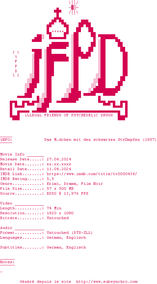 | Voir le nfo de la release Das.Maedchen.Mit.Den.Schwarzen.Struempfen.1957.DUAL.COMPLETE.BLURAY-iFPD | iFPD | Das.Maedchen.Mit.Den.Schwarzen.Struempfen.1957.DUAL.COMPLETE.BLURAY-iFPD OpenSubtitles | 0 fichier |