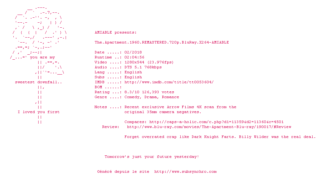 Voir le nfo de la release The.Apartment.1960.REMASTERED.1080p.BluRay.x264-AMIABLE