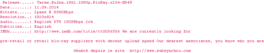 Synchro du sous-titre "Taras.Bulba.1962.1080p.BluRay.x264-CiNEFiLE-fr"