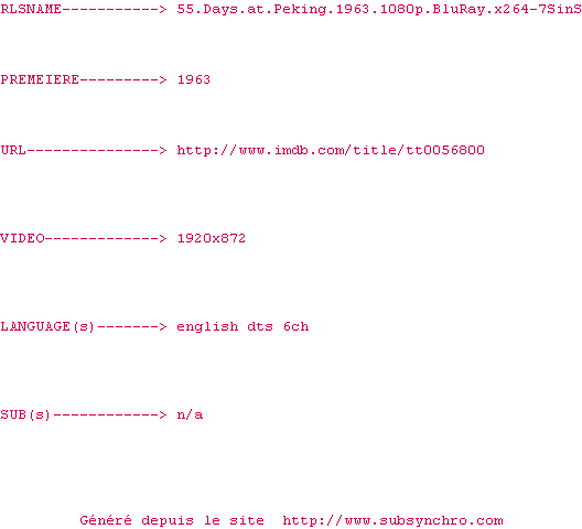 Y avez-vous pense ? Nous proposons déjà 2 sous-titres pour le film Les 55 jours de pékin. Avez-vous essaye de voir si ces sous-titres etaient compatibles avec cette release ? On vous laisse le soin de tester cela pour nous et de contribuer au site en postant le sous-titre en cas de compatiblite constatee !