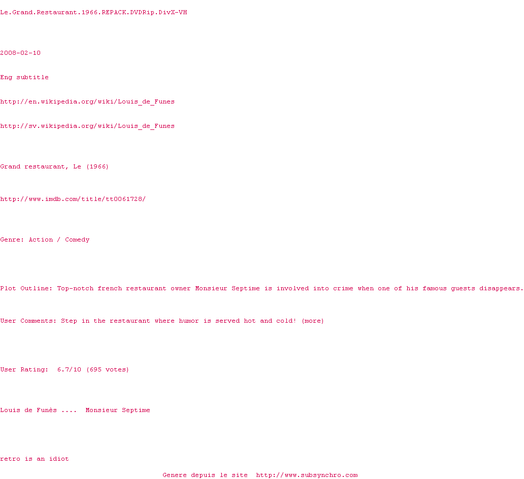 Y avez-vous pense ? Nous proposons déjà 2 sous-titres pour le film Le Grand Restaurant. Avez-vous essaye de voir si ces sous-titres etaient compatibles avec cette release ? On vous laisse le soin de tester cela pour nous et de contribuer au site en postant le sous-titre en cas de compatiblite constatee !