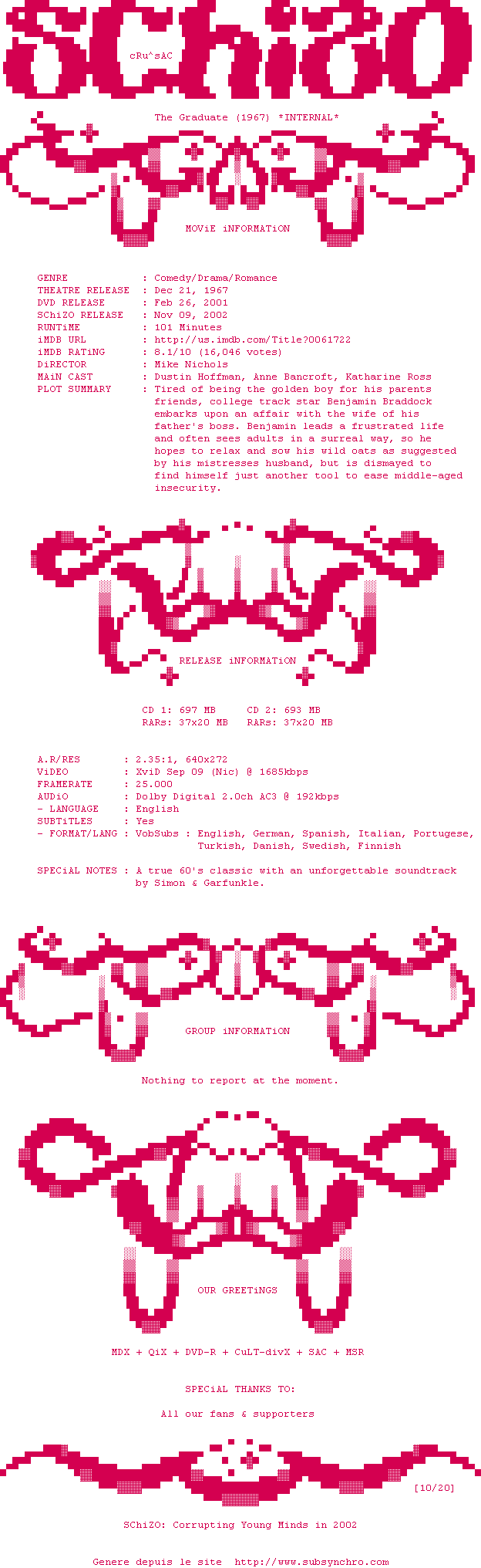 The.Graduate.1967.INTERNAL.DVDRip.XviD-SChiZO.zip Ajouté par SubSynchro Ajoute le 07-02-2010 14:19:23 Format : ZIP Italique : Non Taille : 0.00Ko Telechargement : 252 Le fichier 1-1265548827.zip n'existe pas ! Ajouter cette release à ma collection en cas de telechargement des sous-titres 0 0 0 Telecharger le ZiP contenant NFO, Affiche, Sous-titre (*.zip) Commentez le fichier The.Graduate.1967.INTERNAL.DVDRip.XviD-SChiZO.zip Commentez le fichier The.Graduate.1967.INTERNAL.DVDRip.XviD-SChiZO.zip Commentez ce fichier Le fichier 1-1265548827.zip n'existe pas ! Telechargez le RSS « Fichier de la release The.Graduate.1967.INTERNAL.DVDRip.XviD-SChiZO » Retour au film « Le Lauréat »
