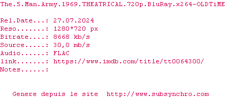 Telechargez le RSS « Fichier de la release The.5.Man.Army.1969.720p.BluRay.x264-OLDTiME »
