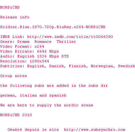 Y avez-vous pense ? Nous proposons déjà 6 sous-titres pour le film Soldat bleu. Avez-vous essaye de voir si ces sous-titres etaient compatibles avec cette release ? On vous laisse le soin de tester cela pour nous et de contribuer au site en postant le sous-titre en cas de compatiblite constatee !
