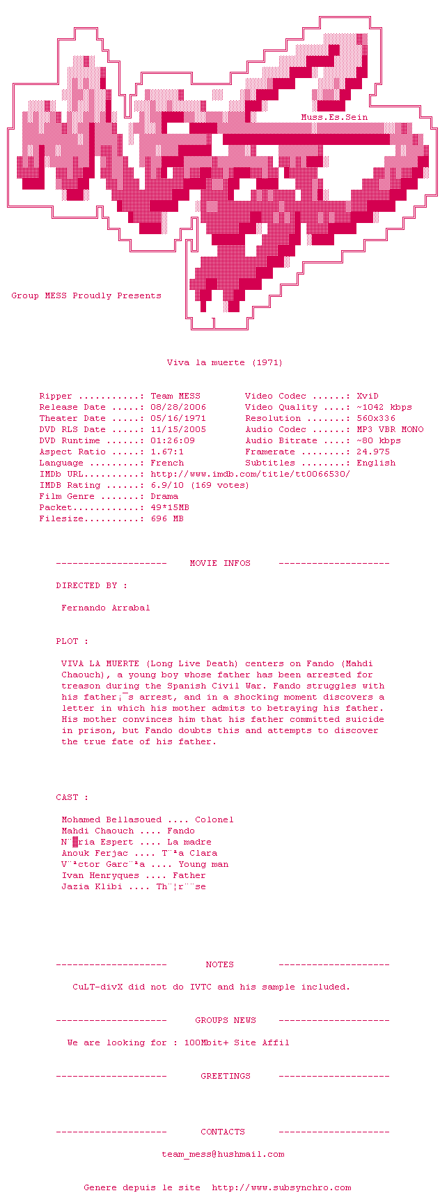 Y avez-vous pense ? Nous proposons déjà 1 sous-titre pour le film Viva la muerte. Avez-vous essaye de voir si ces sous-titres etaient compatibles avec cette release ? On vous laisse le soin de tester cela pour nous et de contribuer au site en postant le sous-titre en cas de compatiblite constatee !