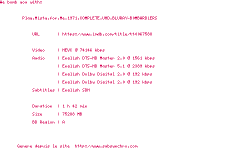 Y avez-vous pense ? Nous proposons déjà 4 sous-titres pour le film Un frisson dans la nuit. Avez-vous essaye de voir si ces sous-titres etaient compatibles avec cette release ? On vous laisse le soin de tester cela pour nous et de contribuer au site en postant le sous-titre en cas de compatiblite constatee !