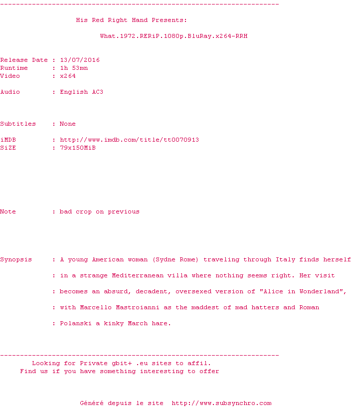 What.1972.RERiP.1080p.BluRay.x264-RRH.srt Ajouté par JohnHi Ajoute le 04-08-2017 08:48:03 Format : SRT Italique : Non Taille : 0.00Ko Telechargement : 118 Sous-titre Extrait d'un DVD Z2 Ajouter cette release à ma collection en cas de telechargement des sous-titres 0 0 0 Telecharger le ZiP contenant NFO, Affiche, Sous-titre (*.srt) Commentez le fichier What.1972.RERiP.1080p.BluRay.x264-RRH.srt Commentez le fichier What.1972.RERiP.1080p.BluRay.x264-RRH.srt Commentez ce fichier Le fichier 20716-1501829283.srt n'existe pas ! Telechargez le RSS « Fichier de la release What.1972.RERiP.1080p.BluRay.x264-RRH » Retour a la release « What.1972.RERiP.1080p.BluRay.x264-RRH »