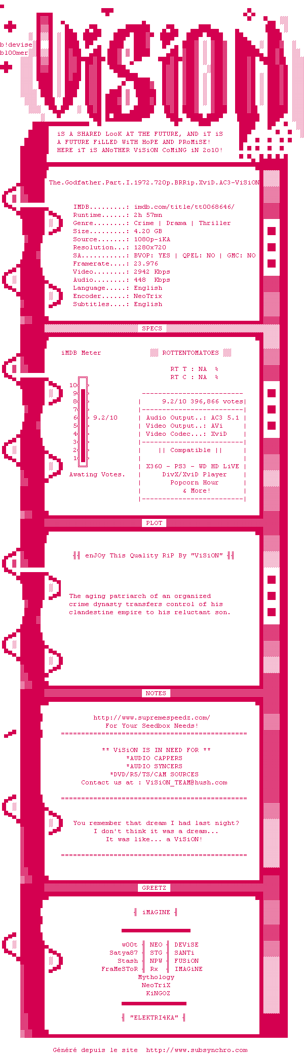 The.Godfather.1972.720p.BRRip.XviD.AC3-ViSiON.srt Ajouté par Pierrick Ajoute le 27-05-2011 17:04:41 Format : SRT Italique : Non Taille : 0.00Ko Telechargement : 665 Ajouter cette release à ma collection en cas de telechargement des sous-titres 0 0 0 Telecharger le ZiP contenant NFO, Affiche, Sous-titre (*.srt) Commentez le fichier The.Godfather.1972.720p.BRRip.XviD.AC3-ViSiON.srt Commentez le fichier The.Godfather.1972.720p.BRRip.XviD.AC3-ViSiON.srt Commentez ce fichier Le fichier 1120-1306508681.srt n'existe pas ! Telechargez le RSS « Fichier de la release The.Godfather.1972.720p.BRRip.XviD.AC3-ViSiON » Retour au film « Le Parrain »