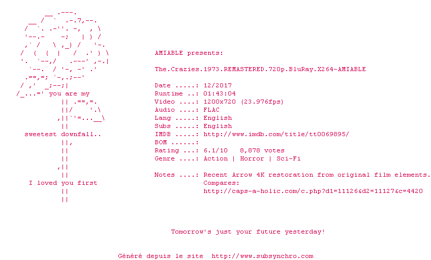 Y avez-vous pense ? Nous proposons déjà 3 sous-titres pour le film La Nuit des fous vivants. Avez-vous essaye de voir si ces sous-titres etaient compatibles avec cette release ? On vous laisse le soin de tester cela pour nous et de contribuer au site en postant le sous-titre en cas de compatiblite constatee !
