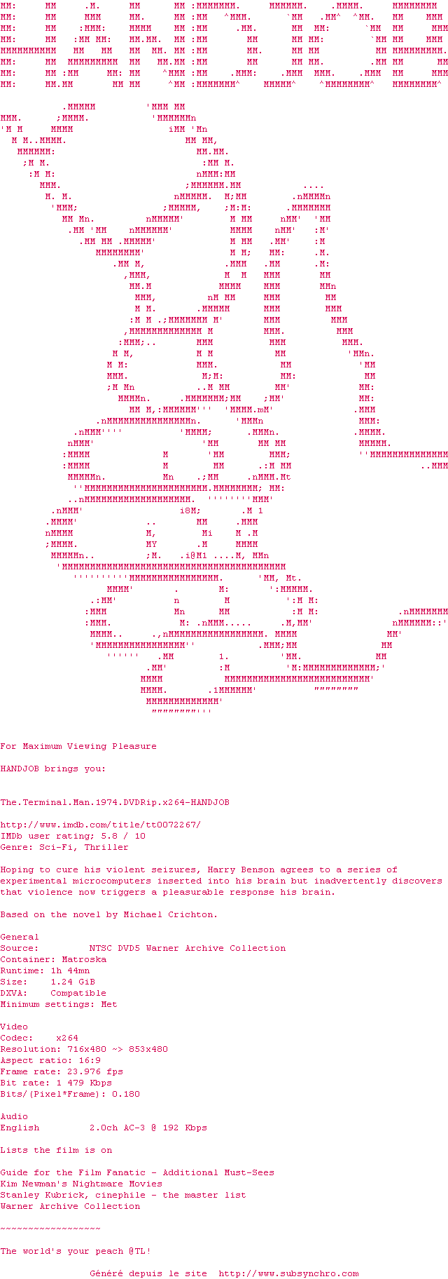 The.Terminal.Man.1974.DVDRip.x264-HANDJOB.srt Ce fichier a été testé et validé par Ultimhate Ajouté par Ultimhate Ajoute le 23-02-2017 09:51:04 Format : SRT Italique : Non Taille : 0.00Ko Telechargement : 63 Testé par le membre Ajouter cette release à ma collection en cas de telechargement des sous-titres 0 0 0 Telecharger le ZiP contenant NFO, Affiche, Sous-titre (*.srt) Commentez le fichier The.Terminal.Man.1974.DVDRip.x264-HANDJOB.srt Commentez le fichier The.Terminal.Man.1974.DVDRip.x264-HANDJOB.srt Commentez ce fichier Le fichier 138-1487839864.srt n'existe pas ! Telechargez le RSS « Fichier de la release The.Terminal.Man.1974.DVDRip.x264-HANDJOB » Retour au film « Homicides incontrôlés »