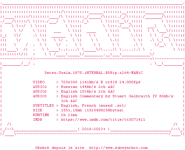 Y avez-vous pense ? Nous proposons déjà 3 sous-titres pour le film Dersou Ouzala. Avez-vous essaye de voir si ces sous-titres etaient compatibles avec cette release ? On vous laisse le soin de tester cela pour nous et de contribuer au site en postant le sous-titre en cas de compatiblite constatee !