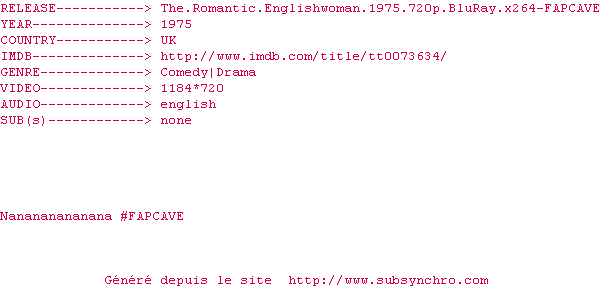 Telechargez le RSS « Fichier de la release The.Romantic.Englishwoman.1975.720p.BluRay.x264-FAPCAVE »