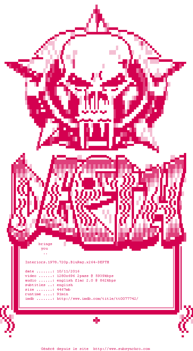 Interiors.1978.720p.BluRay.x264-DEPTHPRiME.fr.srt Ajouté par SubSynchro Ajoute le 16-12-2016 14:50:14 Format : SRT Italique : Non Taille : 0.00Ko Telechargement : 59 Ajouter cette release à ma collection en cas de telechargement des sous-titres 0 0 0 Telecharger le ZiP contenant NFO, Affiche, Sous-titre (*.srt) Commentez le fichier Interiors.1978.720p.BluRay.x264-DEPTHPRiME.fr.srt Commentez le fichier Interiors.1978.720p.BluRay.x264-DEPTHPRiME.fr.srt Commentez ce fichier Le fichier 1-1481896214.srt n'existe pas ! Telechargez le RSS « Fichier de la release Interiors.1978.720p.BluRay.x264-DEPTH » Retour au film « Intérieurs »