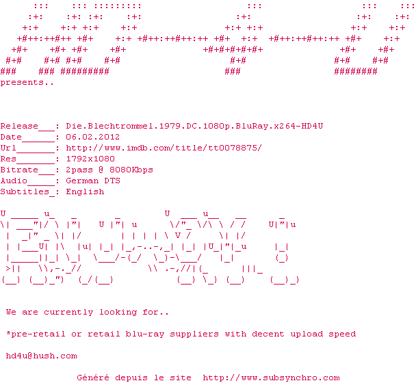 Y avez-vous pense ? Nous proposons déjà 2 sous-titres pour le film Le Tambour. Avez-vous essaye de voir si ces sous-titres etaient compatibles avec cette release ? On vous laisse le soin de tester cela pour nous et de contribuer au site en postant le sous-titre en cas de compatiblite constatee !