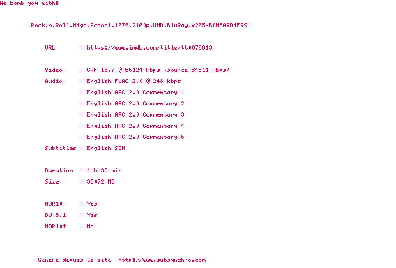 Y avez-vous pense ? Nous proposons déjà 1 sous-titre pour le film Le Lycée des cancres. Avez-vous essaye de voir si ces sous-titres etaient compatibles avec cette release ? On vous laisse le soin de tester cela pour nous et de contribuer au site en postant le sous-titre en cas de compatiblite constatee !