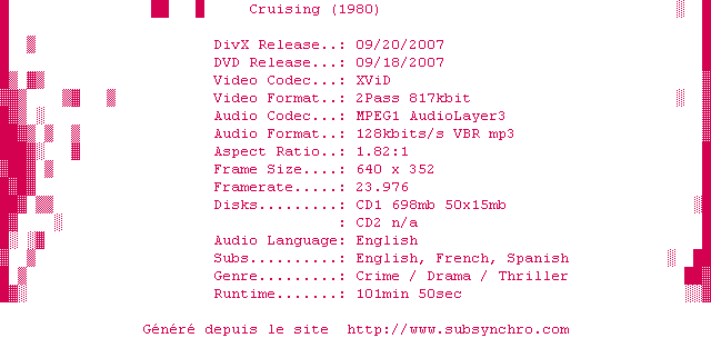 Cruising.1980.Z1.FRAGMENT.srt Ajouté par Ultimhate Ajoute le 31-08-2010 23:13:53 Format : SRT Italique : Non Taille : 0.00Ko Telechargement : 136 Sous-titre Extrait d'un DVD Z1 Ajouter cette release à ma collection en cas de telechargement des sous-titres 0 0 0 Telecharger le ZiP contenant NFO, Affiche, Sous-titre (*.srt) Commentez le fichier Cruising.1980.Z1.FRAGMENT.srt Commentez le fichier Cruising.1980.Z1.FRAGMENT.srt Commentez ce fichier Le fichier 138-1283289292.srt n'existe pas ! Telechargez le RSS « Fichier de la release Cruising.1980.DVDRip.XviD-FRAGMENT » Retour a la release « Cruising.1980.DVDRip.XviD-FRAGMENT »