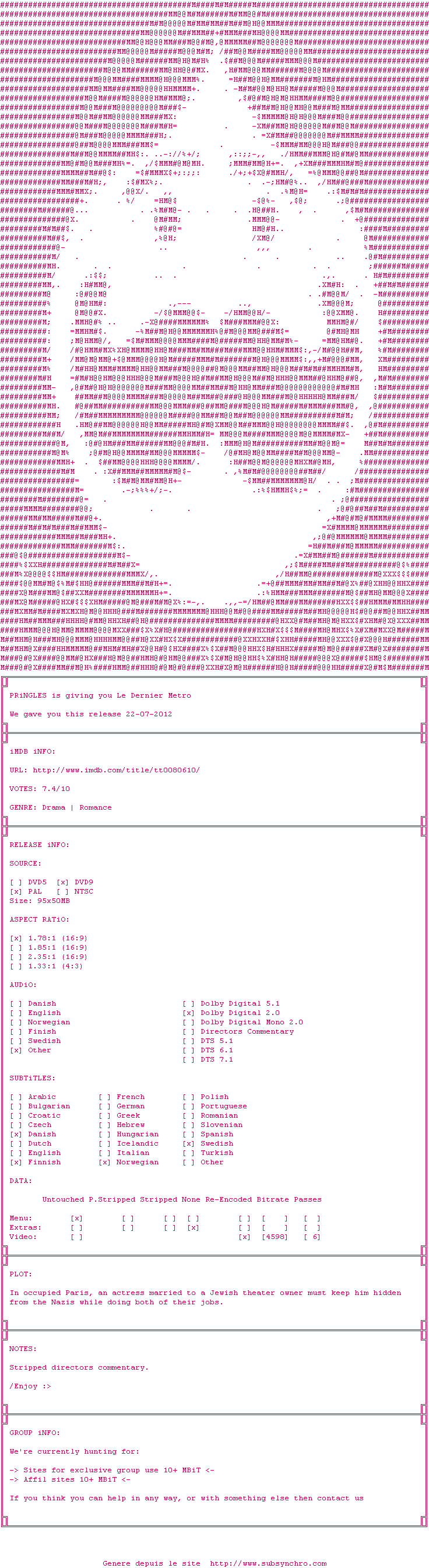 Y avez-vous pense ? Nous proposons déjà 1 sous-titre pour le film Le Dernier métro. Avez-vous essaye de voir si ces sous-titres etaient compatibles avec cette release ? On vous laisse le soin de tester cela pour nous et de contribuer au site en postant le sous-titre en cas de compatiblite constatee !