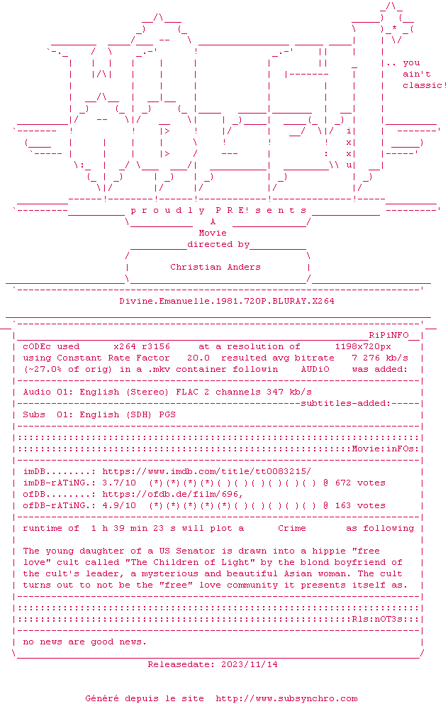 Telechargez le RSS « Fichier de la release Divine.Emanuelle.1981.720P.BLURAY.x264-WATCHABLE »