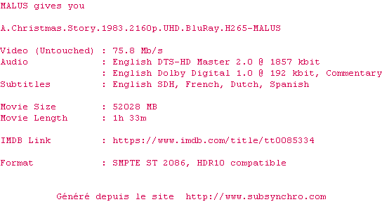 Y avez-vous pense ? Nous proposons déjà 6 sous-titres pour le film A Christmas Story. Avez-vous essaye de voir si ces sous-titres etaient compatibles avec cette release ? On vous laisse le soin de tester cela pour nous et de contribuer au site en postant le sous-titre en cas de compatiblite constatee !