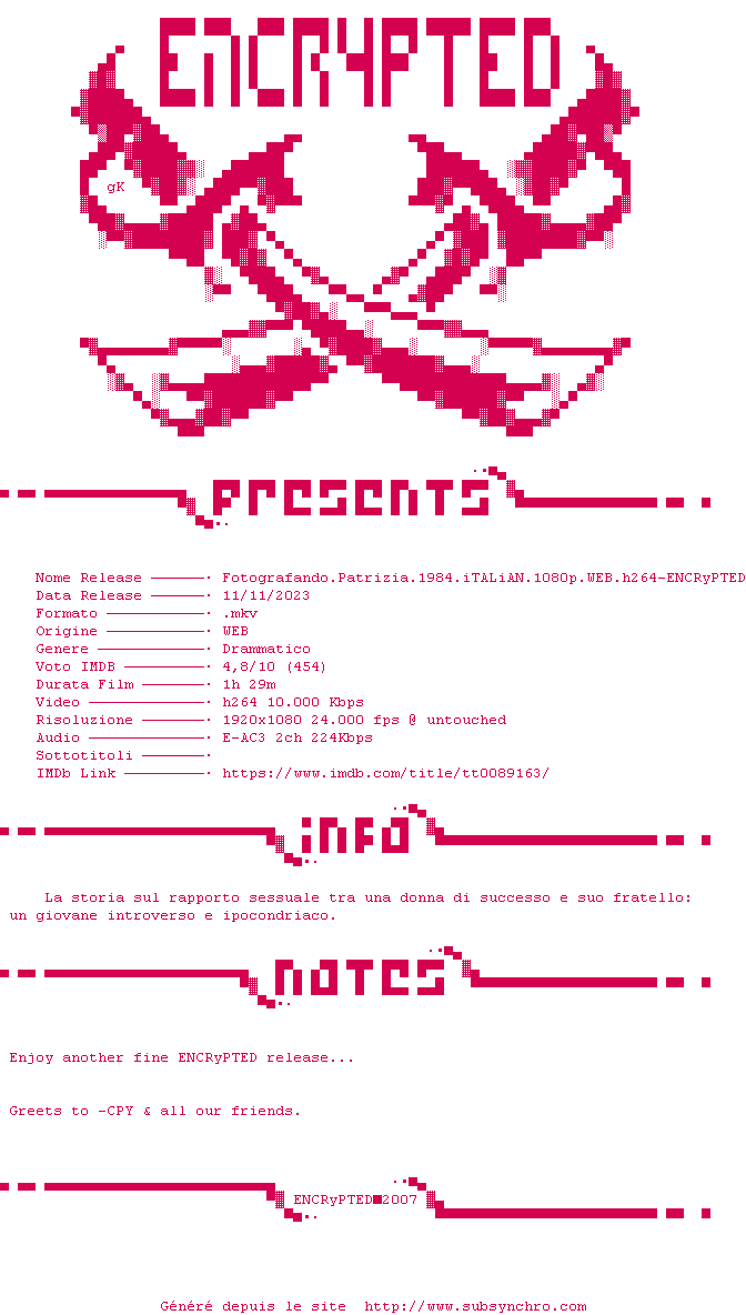 Telechargez le RSS « Fichier de la release Otografando.Patrizia.1984.ITALiAN.1080p.WEB.H264-ENCRyPTED »