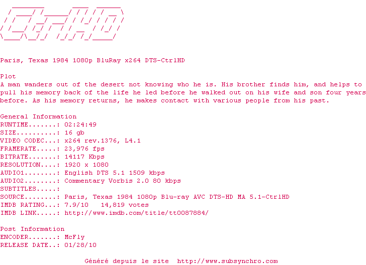 Y avez-vous pense ? Nous proposons déjà 7 sous-titres pour le film Paris, Texas. Avez-vous essaye de voir si ces sous-titres etaient compatibles avec cette release ? On vous laisse le soin de tester cela pour nous et de contribuer au site en postant le sous-titre en cas de compatiblite constatee !