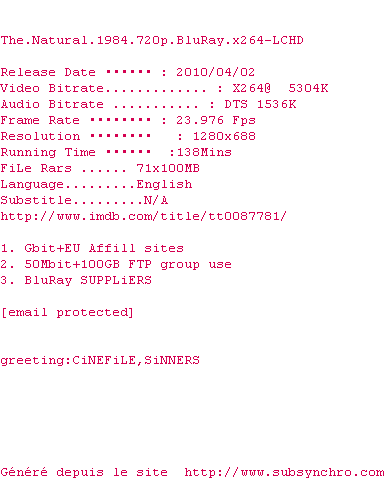 The.Natural.1984.720p.BluRay.x264-LCHD.srt Ajouté par SubSynchro Ajoute le 05-04-2010 03:06:06 Format : SRT Italique : Non Taille : 0.00Ko Telechargement : 170 Ajouter cette release à ma collection en cas de telechargement des sous-titres 0 0 0 Telecharger le ZiP contenant NFO, Affiche, Sous-titre (*.srt) Commentez le fichier The.Natural.1984.720p.BluRay.x264-LCHD.srt Commentez le fichier The.Natural.1984.720p.BluRay.x264-LCHD.srt Commentez ce fichier Le fichier 1-1270429582.srt n'existe pas ! Telechargez le RSS « Fichier de la release The.Natural.1984.720p.BluRay.x264-LCHD » Retour a la release « The.Natural.1984.720p.BluRay.x264-LCHD »