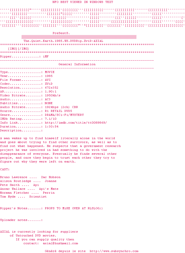 The.Quiet.Earth.1985.DVDRip.XviD-AXIAL.zip Ajouté par Ultimhate Ajoute le 12-08-2010 00:08:28 Format : ZIP Italique : Non Taille : 0.00Ko Telechargement : 83 Le fichier 138-1281564538.zip n'existe pas ! Sous-titre « Fansub » Ajouter cette release à ma collection en cas de telechargement des sous-titres 0 0 0 Telecharger le ZiP contenant NFO, Affiche, Sous-titre (*.zip) Commentez le fichier The.Quiet.Earth.1985.DVDRip.XviD-AXIAL.zip Commentez le fichier The.Quiet.Earth.1985.DVDRip.XviD-AXIAL.zip Commentez ce fichier Le fichier 138-1281564538.zip n'existe pas ! Telechargez le RSS « Fichier de la release The.Quiet.Earth.1985.WS.DVDRip.XviD-AXIAL » Retour au film « Le Dernier Survivant »