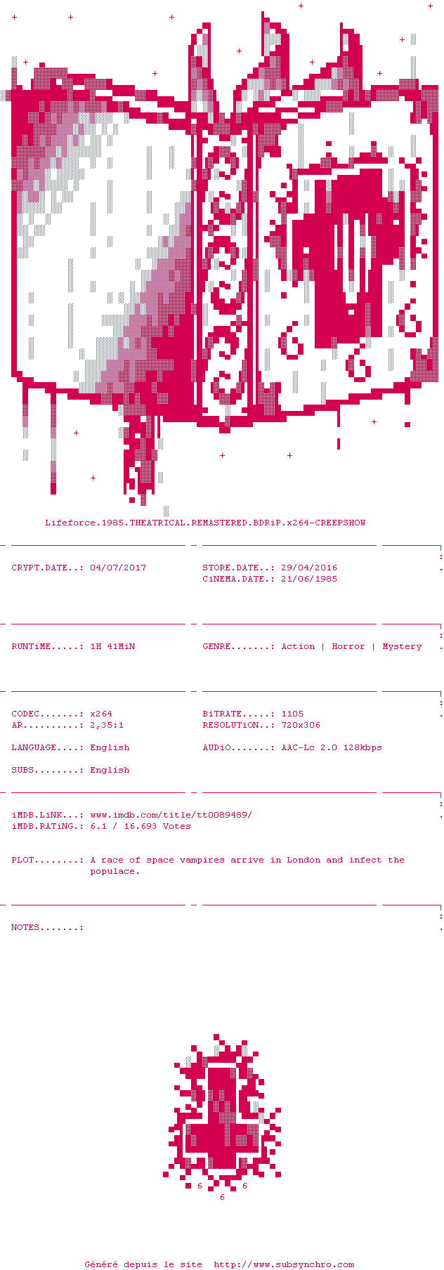 Y avez-vous pense ? Nous proposons déjà 5 sous-titres pour le film Lifeforce : L'Étoile du mal. Avez-vous essaye de voir si ces sous-titres etaient compatibles avec cette release ? On vous laisse le soin de tester cela pour nous et de contribuer au site en postant le sous-titre en cas de compatiblite constatee !