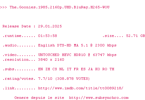La release The.Goonies.1985.2160p.UHD.BluRay.H265-WOU est en 4K