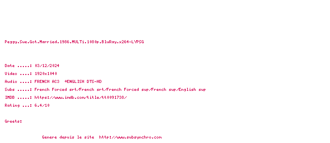 | Voir le nfo de la release Peggy.Sue.Got.Married.1986.MULTi.1080p.BluRay.x264-LYPSG | LYPSG | Peggy.Sue.Got.Married.1986.MULTi.1080p.BluRay.x264-LYPSG OpenSubtitles | 0 fichier | ||