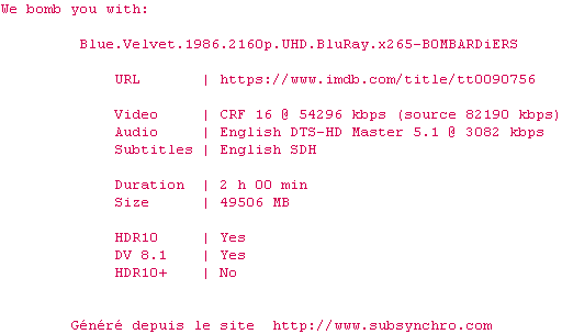 Y avez-vous pense ? Nous proposons déjà 12 sous-titres pour le film Blue Velvet. Avez-vous essaye de voir si ces sous-titres etaient compatibles avec cette release ? On vous laisse le soin de tester cela pour nous et de contribuer au site en postant le sous-titre en cas de compatiblite constatee !