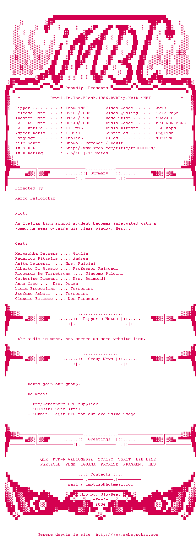 Telechargez le RSS « Fichier de la release Devil.In.The.Flesh.1986.DVDRip.XviD-iMBT »