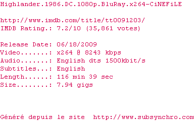 Highlander.1986.DC.1080p.BluRay.x264-CiNEFiLE.srt Ce fichier a été testé et validé par Stank07 Ajouté par Stank07 Ajoute le 24-07-2016 17:42:03 Format : SRT Italique : Non Taille : 0.00Ko Telechargement : 75 Testé par le membre Ajouter cette release à ma collection en cas de telechargement des sous-titres 0 0 0 Telecharger le ZiP contenant NFO, Affiche, Sous-titre (*.srt) Commentez le fichier Highlander.1986.DC.1080p.BluRay.x264-CiNEFiLE.srt Commentez le fichier Highlander.1986.DC.1080p.BluRay.x264-CiNEFiLE.srt Commentez ce fichier Le fichier 10452-1469374923.srt n'existe pas ! Telechargez le RSS « Fichier de la release Highlander.1986.DC.1080p.BluRay.x264-CiNEFiLE » Retour au film « Highlander »