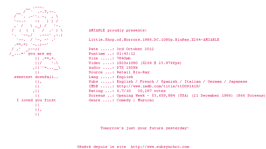 Little.Shop.of.Horrors.1986.DC.1080p.BluRay.X264-AMIABLE-.srt Ajouté par B2874 Ajoute le 17-11-2012 23:01:31 Format : SRT Italique : Oui Taille : 0.00Ko Telechargement : 139 Sous-titre Extrait d'un DVD Z1 Ajouter cette release à ma collection en cas de telechargement des sous-titres 0 0 0 Telecharger le ZiP contenant NFO, Affiche, Sous-titre (*.srt) Commentez le fichier Little.Shop.of.Horrors.1986.DC.1080p.BluRay.X264-AMIABLE-.srt Commentez le fichier Little.Shop.of.Horrors.1986.DC.1080p.BluRay.X264-AMIABLE-.srt Commentez ce fichier Le fichier 7202-1353189691.srt n'existe pas ! Telechargez le RSS « Fichier de la release Little.Shop.of.Horrors.1986.DC.1080p.BluRay.X264-AMIABLE » Retour au film « La Petite Boutique des horreurs »