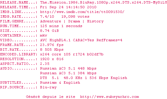 The.Mission.1986.BluRay.1080p.x264.DTS.x264.DTS-MySiLU.srt Ajouté par Ultimhate Ajoute le 12-07-2013 02:12:25 Format : SRT Italique : Non Taille : 0.00Ko Telechargement : 125 Sous-titre Extrait d'un DVD Z1 Ajouter cette release à ma collection en cas de telechargement des sous-titres 0 0 0 Telecharger le ZiP contenant NFO, Affiche, Sous-titre (*.srt) Commentez le fichier The.Mission.1986.BluRay.1080p.x264.DTS.x264.DTS-MySiLU.srt Commentez le fichier The.Mission.1986.BluRay.1080p.x264.DTS.x264.DTS-MySiLU.srt Commentez ce fichier Le fichier 138-1373587945.srt n'existe pas ! Telechargez le RSS « Fichier de la release The.Mission.1986.BluRay.1080p.x264.DTS.x264.DTS-MySiLU » Retour au film « Mission »