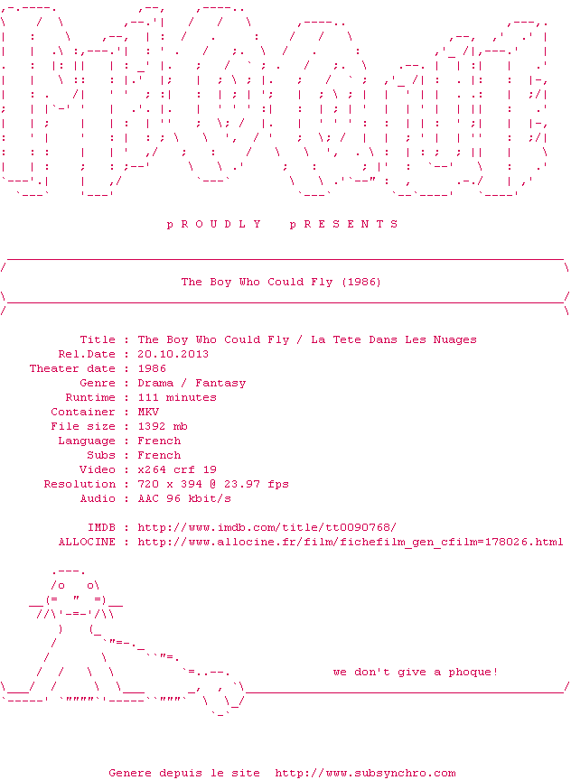 Y avez-vous pense ? Nous proposons déjà 2 sous-titres pour le film Rendez-vous dans les nuages. Avez-vous essaye de voir si ces sous-titres etaient compatibles avec cette release ? On vous laisse le soin de tester cela pour nous et de contribuer au site en postant le sous-titre en cas de compatiblite constatee !