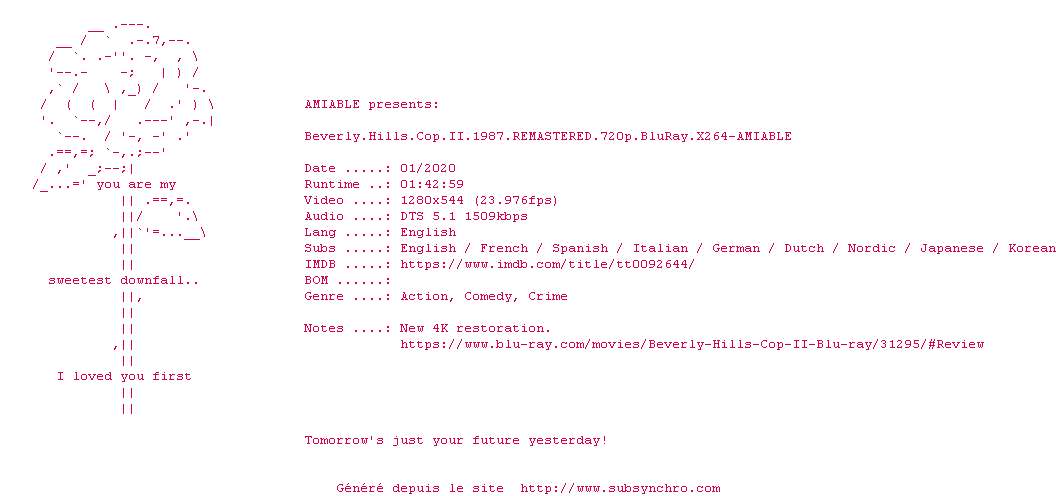 Beverly-Hills-Cop-II-1987-REMASTERED-BluRay-AMIABLE-French.srt Ajouté par SubSynchro Ajoute le 22-04-2024 12:07:20 Format : SRT Italique : Non Taille : 0.00Ko Telechargement : 17 Merci àZodler sur YiFY Ajouter cette release à ma collection en cas de telechargement des sous-titres 0 0 0 Telecharger le ZiP contenant NFO, Affiche, Sous-titre (*.srt) Commentez le fichier Beverly-Hills-Cop-II-1987-REMASTERED-BluRay-AMIABLE-French.srt Commentez le fichier Beverly-Hills-Cop-II-1987-REMASTERED-BluRay-AMIABLE-French.srt Commentez ce fichier Le fichier 1-1713780440.srt n'existe pas ! Telechargez le RSS « Fichier de la release Beverly.Hills.Cop.II.1987.REMASTERED.720p.BluRay.x264-AMIABLE » Retour a la release « Beverly.Hills.Cop.II.1987.REMASTERED.720p.BluRay.x264-AMIABLE »
