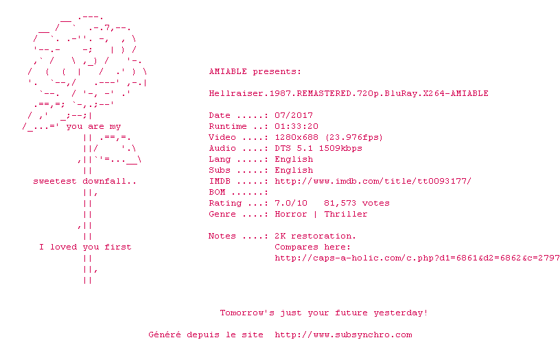 Y avez-vous pense ? Nous proposons déjà 7 sous-titres pour le film Hellraiser : Le Pacte. Avez-vous essaye de voir si ces sous-titres etaient compatibles avec cette release ? On vous laisse le soin de tester cela pour nous et de contribuer au site en postant le sous-titre en cas de compatiblite constatee !