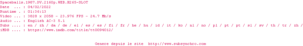 Y avez-vous pense ? Nous proposons déjà 12 sous-titres pour le film La Folle Histoire de l'espace. Avez-vous essaye de voir si ces sous-titres etaient compatibles avec cette release ? On vous laisse le soin de tester cela pour nous et de contribuer au site en postant le sous-titre en cas de compatiblite constatee !