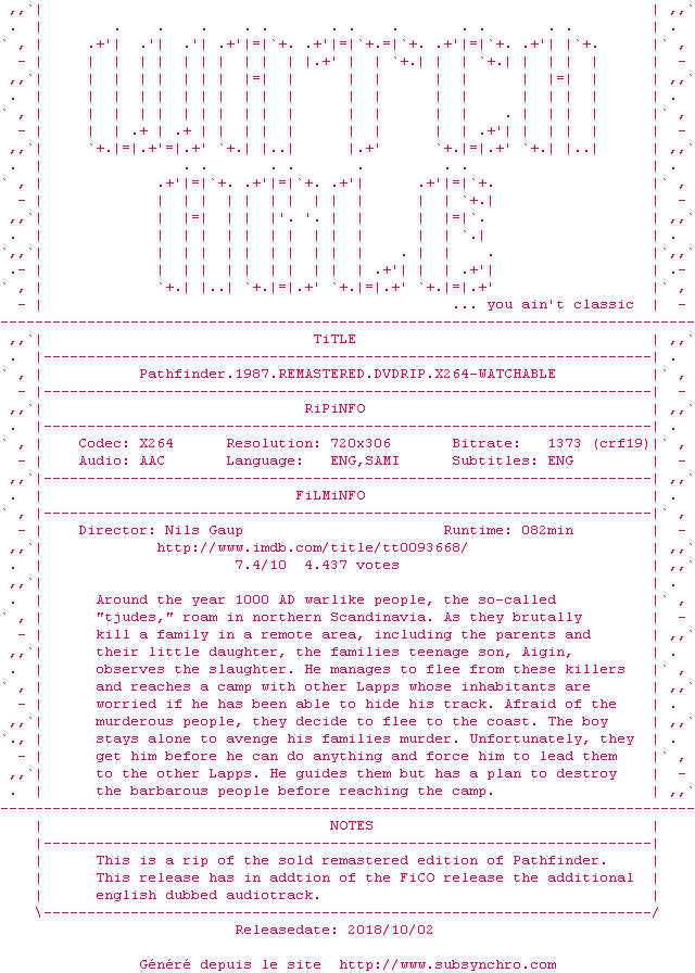 Y avez-vous pense ? Nous proposons déjà 1 sous-titre pour le film Le Passeur / Pathfinder. Avez-vous essaye de voir si ces sous-titres etaient compatibles avec cette release ? On vous laisse le soin de tester cela pour nous et de contribuer au site en postant le sous-titre en cas de compatiblite constatee !