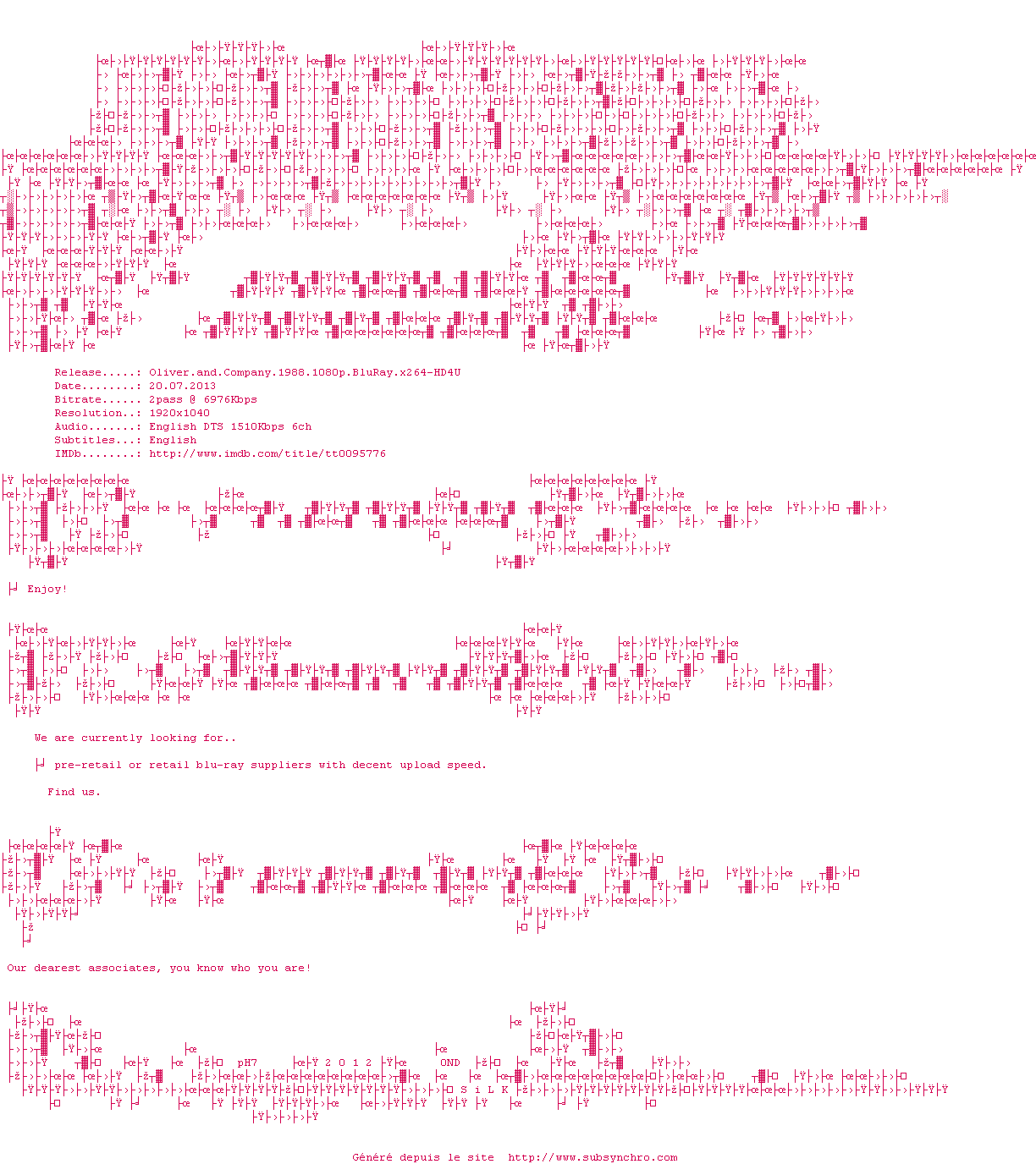 Y avez-vous pense ? Nous proposons déjà 1 sous-titre pour le film Oliver et Compagnie. Avez-vous essaye de voir si ces sous-titres etaient compatibles avec cette release ? On vous laisse le soin de tester cela pour nous et de contribuer au site en postant le sous-titre en cas de compatiblite constatee !