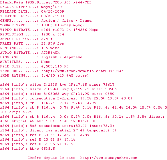 Black.Rain.1989.Bluray.720p.AC3.x264-CHD.srt Ce fichier a été testé et validé par Ultimhate Ajouté par Ultimhate Ajoute le 10-01-2012 20:55:18 Format : SRT Italique : Non Taille : 0.00Ko Telechargement : 145 Testé par le membre Ajouter cette release à ma collection en cas de telechargement des sous-titres 0 0 0 Telecharger le ZiP contenant NFO, Affiche, Sous-titre (*.srt) Commentez le fichier Black.Rain.1989.Bluray.720p.AC3.x264-CHD.srt Commentez le fichier Black.Rain.1989.Bluray.720p.AC3.x264-CHD.srt Commentez ce fichier Le fichier 138-1326225335.srt n'existe pas ! Telechargez le RSS « Fichier de la release Black.Rain.1989.Bluray.720p.AC3.x264-CHD » Retour au film « Black Rain »