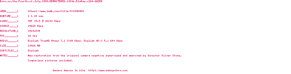 Y avez-vous pense ? Nous proposons déjà 9 sous-titres pour le film Né un 4 juillet. Avez-vous essaye de voir si ces sous-titres etaient compatibles avec cette release ? On vous laisse le soin de tester cela pour nous et de contribuer au site en postant le sous-titre en cas de compatiblite constatee !