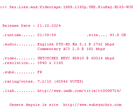 La release Sex.Lies.And.Videotape.1989.2160p.UHD.BluRay.H265-WOU est en 4K