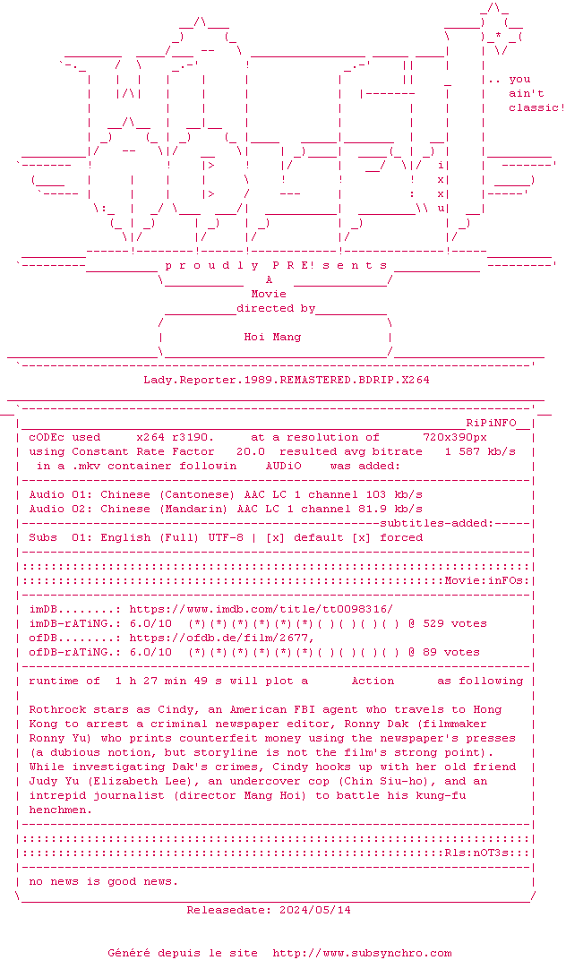 Y avez-vous pense ? Nous proposons déjà 1 sous-titre pour le film Une flic de choc 2 / Lady Reporter. Avez-vous essaye de voir si ces sous-titres etaient compatibles avec cette release ? On vous laisse le soin de tester cela pour nous et de contribuer au site en postant le sous-titre en cas de compatiblite constatee !
