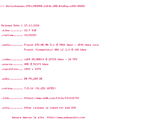Y avez-vous pense ? Nous proposons déjà 1 sous-titre pour le film Delicatessen. Avez-vous essaye de voir si ces sous-titres etaient compatibles avec cette release ? On vous laisse le soin de tester cela pour nous et de contribuer au site en postant le sous-titre en cas de compatiblite constatee !