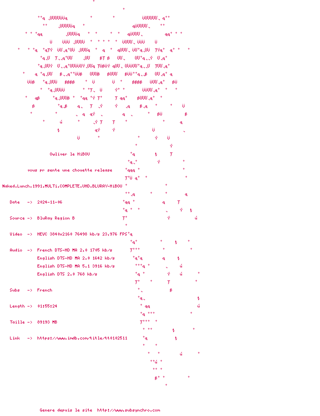 Y avez-vous pense ? Nous proposons déjà 12 sous-titres pour le film Le Festin nu. Avez-vous essaye de voir si ces sous-titres etaient compatibles avec cette release ? On vous laisse le soin de tester cela pour nous et de contribuer au site en postant le sous-titre en cas de compatiblite constatee !